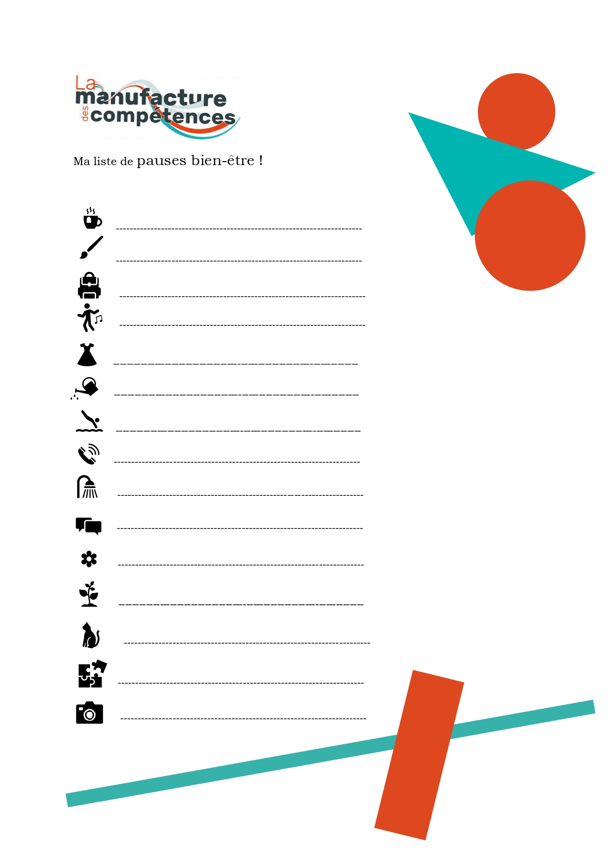 Je conseille souvent de prendre une feuille de papier et y lister toutes vos sources d’énergie, tout ce qui vous ressource (dormir, prendre un bon café, parler avec un ami /une amie, pratiquer un sport, jardiner, prendre des photos, bricoler, cuisiner,…). Bref, tout ce qui vous fait du bien. Téléchargez un modèle de liste